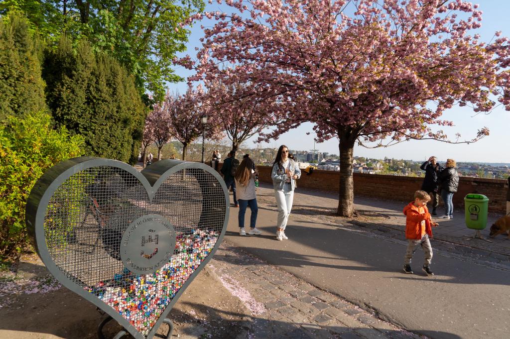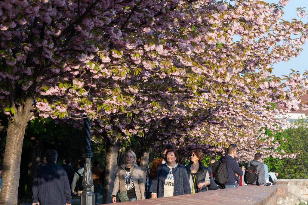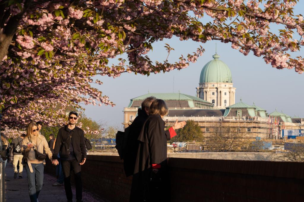 People walk under cherry blossoms on the Castle Hill in Budapest, Hungary, on April 21, 2022. (Photo by Attila Volgyi/Xinhua)