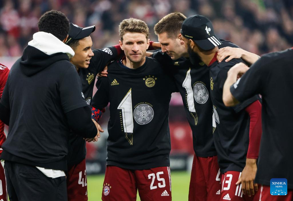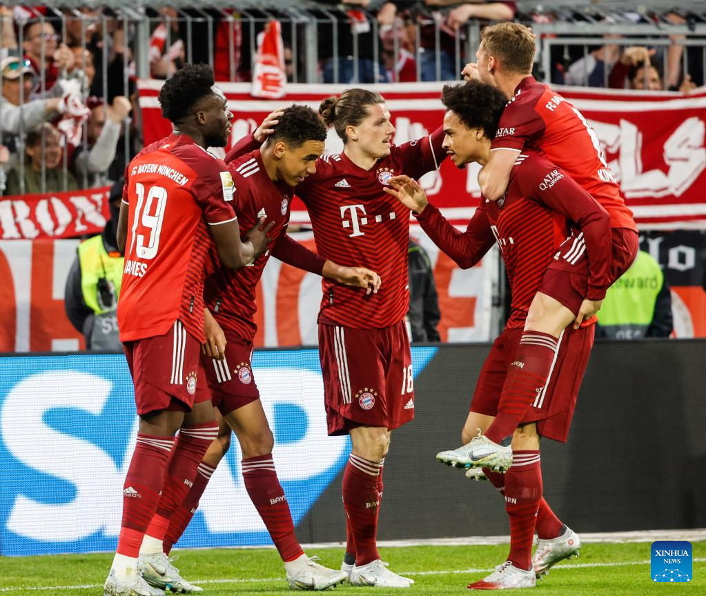 Jamal Musiala (1st L), Thomas Mueller (2nd L), Niklas Suele (2nd R) and Eric Maxim Choupo-Moting of Bayern Munich celebrate winning the title after a German Bundesliga match between Bayern Munich and Borussia Dortmund in Munich, Germany, April 23, 2022. Bayern Munich won 3-1 and claimed the 10th successive Bundesliga title. (Photo by Philippe Ruiz/Xinhua)