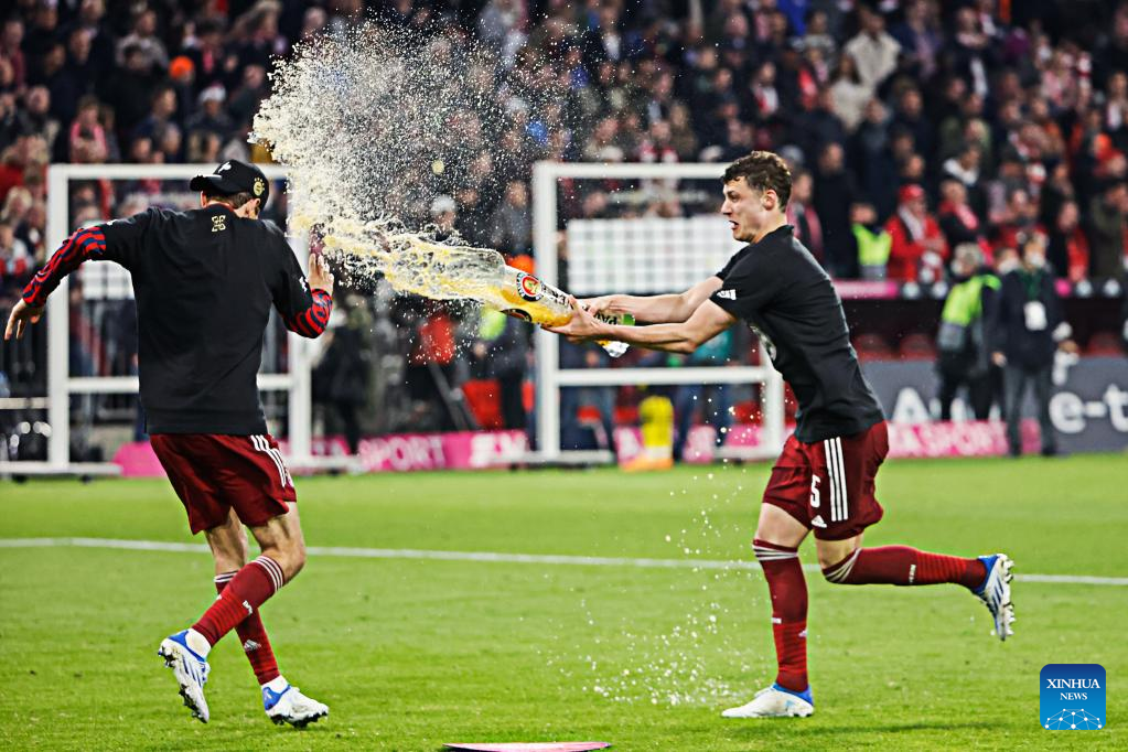 Benjamin Pavard (R) of Bayern Munich celebrates winning the title after a German Bundesliga match between Bayern Munich and Borussia Dortmund in Munich, Germany, April 23, 2022. Bayern Munich won 3-1 and claimed the 10th successive Bundesliga title. (Photo by Philippe Ruiz/Xinhua)