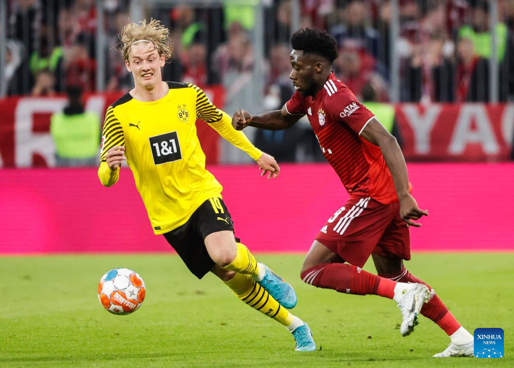 Alphonso Davies (R) of Bayern Munich vies with Julian Brandt of Dortmund during a German Bundesliga match between Bayern Munich and Borussia Dortmund in Munich, Germany, April 23, 2022. Bayern Munich won 3-1 and claimed the 10th successive Bundesliga title. (Photo by Philippe Ruiz/Xinhua)