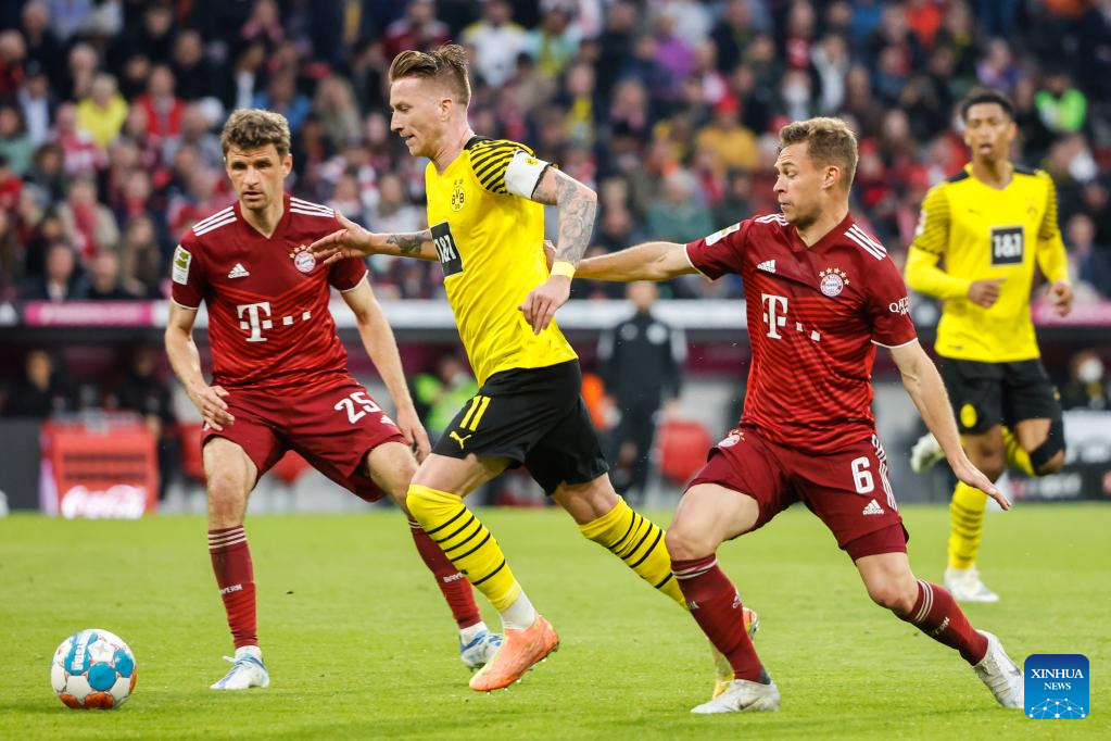 Joshua Kimmich (2nd R) of Bayern Munich vies with Marco Reus (2nd L) of Dortmund during a German Bundesliga match between Bayern Munich and Borussia Dortmund in Munich, Germany, April 23, 2022. Bayern Munich won 3-1 and claimed the 10th successive Bundesliga title. (Photo by Philippe Ruiz/Xinhua)