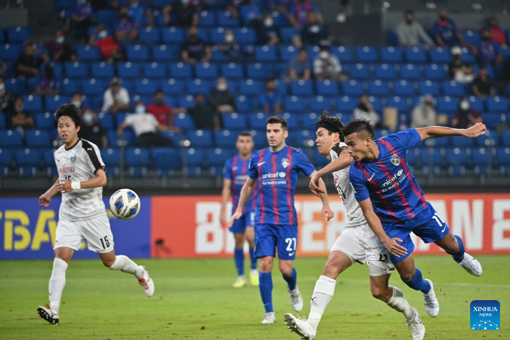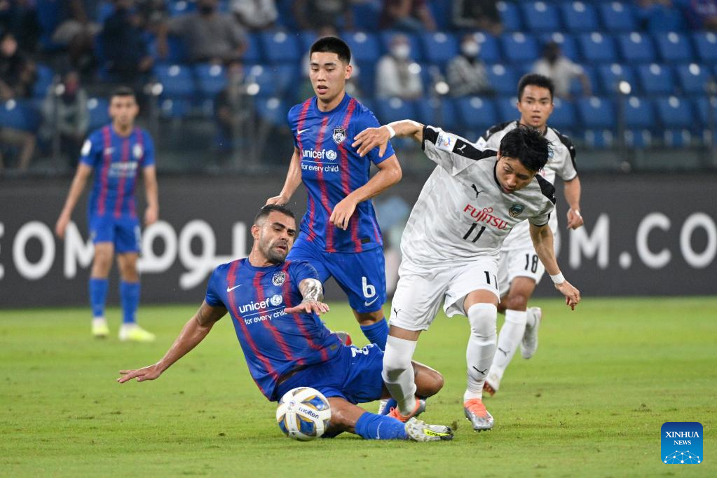 Kento Tachibanada (1st R) of Kawasaki Frontale vies with Fernando Forestieri (2nd R) of Johor Darul Ta'zim during the AFC Champions League 2022 Group I match between Kawasaki Frontale of Japan and Johor Darul Ta'zim of Malaysia in Johor Bahru, Malaysia, April 24, 2022. Kawasaki Frontale won the match 5-0. (Photo by Chong Voon Chung/Xinhua)