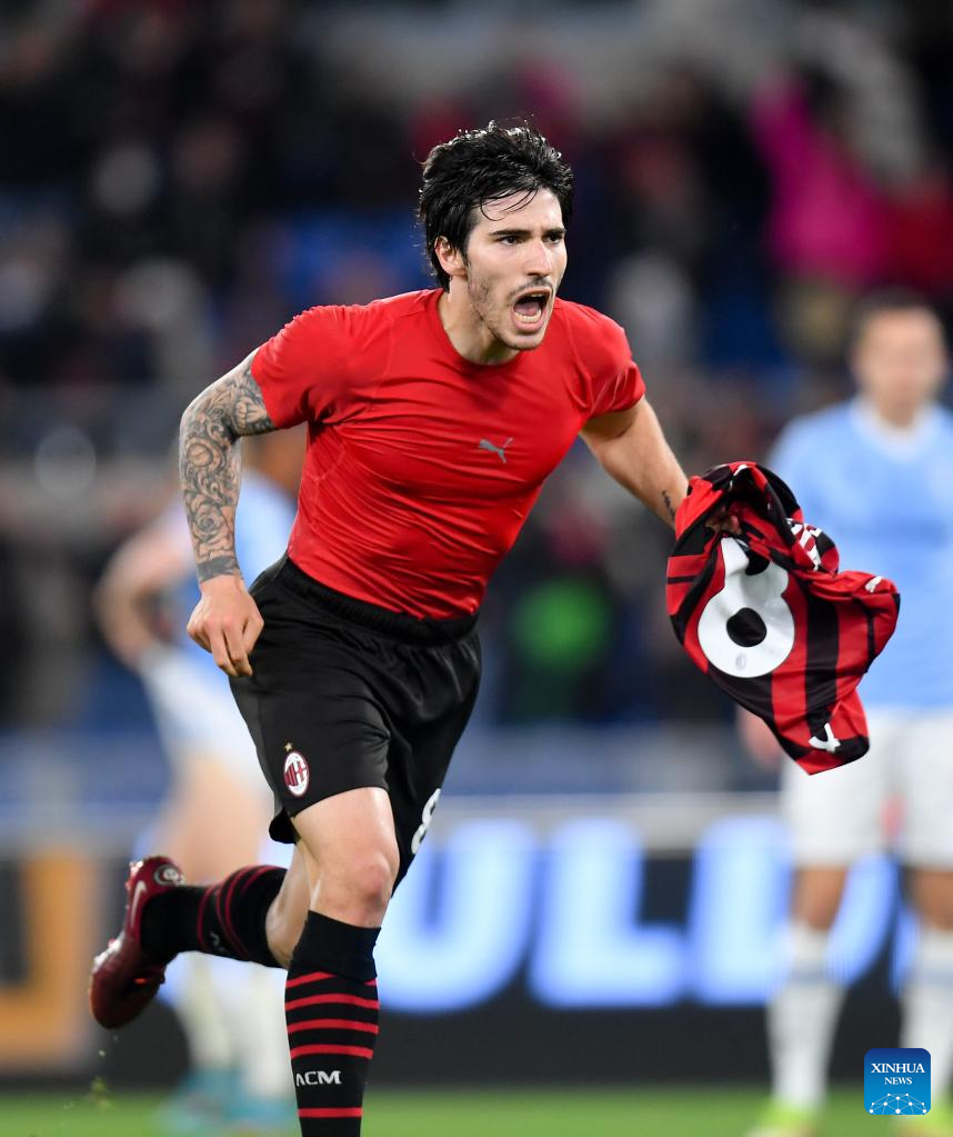 AC Milan's Sandro Tonali celebrates his goal during a Serie A football match between Lazio and AC Milan in Rome, Italy, on April 24, 2022. (Photo by Augusto Casasoli/Xinhua)