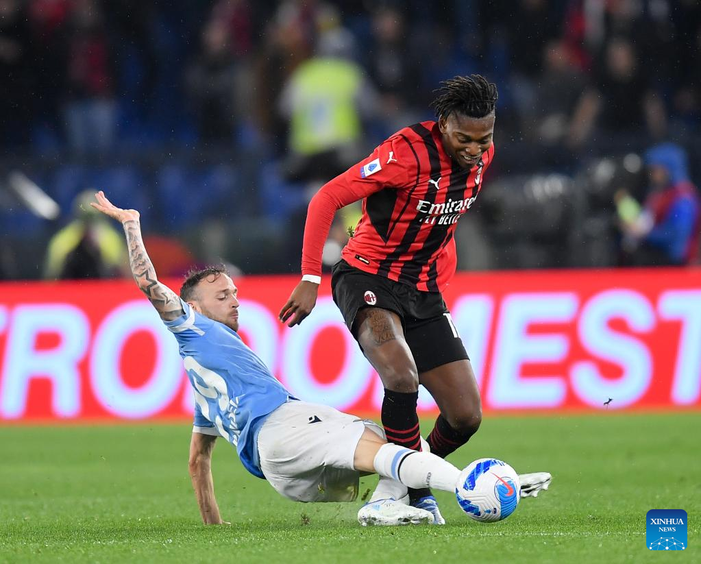 Lazio's Felipe Anderson (L) vies with AC Milan's Rafael Leao during a Serie A football match between Lazio and AC Milan in Rome, Italy, on April 24, 2022. (Photo by Augusto Casasoli/Xinhua)