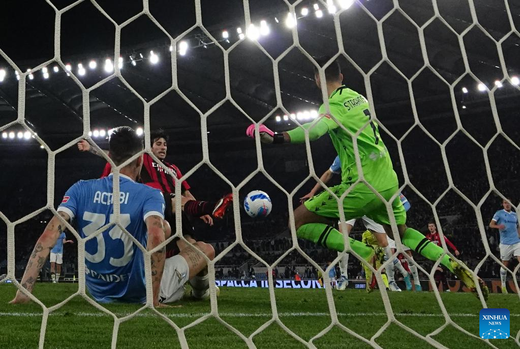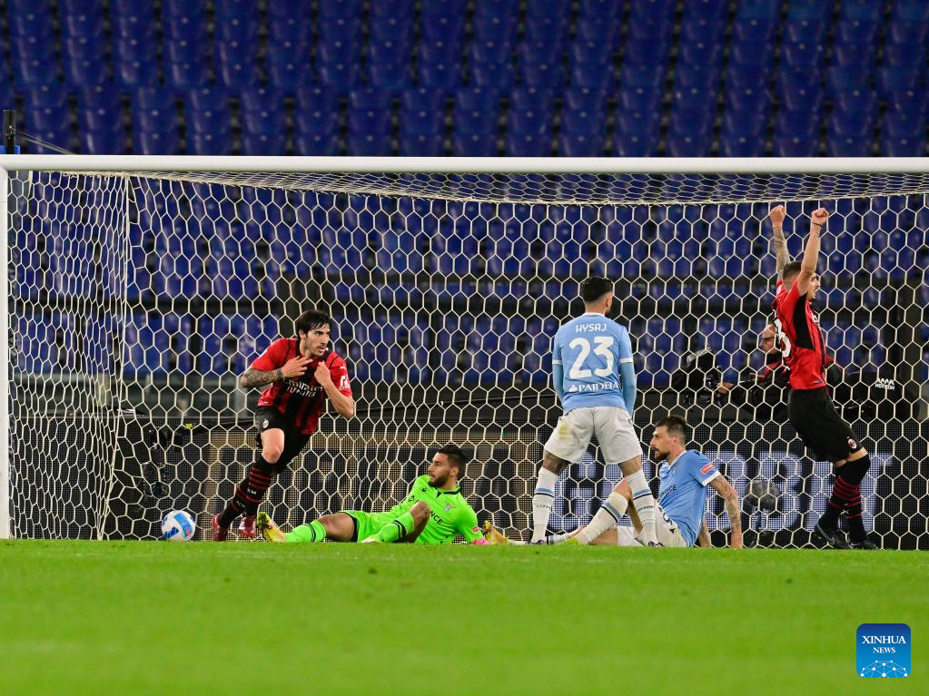 AC Milan's Sandro Tonali (1st L) scores his goal during a Serie A football match between Lazio and AC Milan in Rome, Italy, on April 24, 2022. (Photo by Augusto Casasoli/Xinhua)