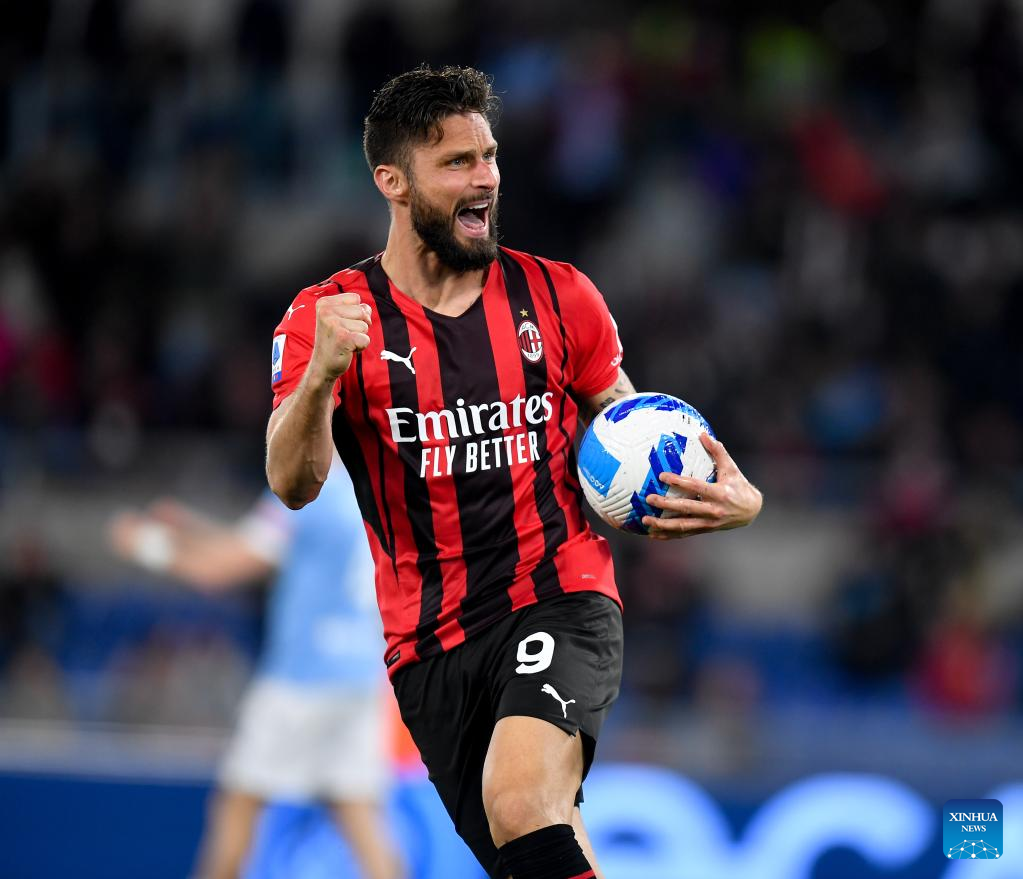AC Milan's Olivier Giroud celebrates his goal during a Serie A football match between Lazio and AC Milan in Rome, Italy, on April 24, 2022. (Photo by Augusto Casasoli/Xinhua)