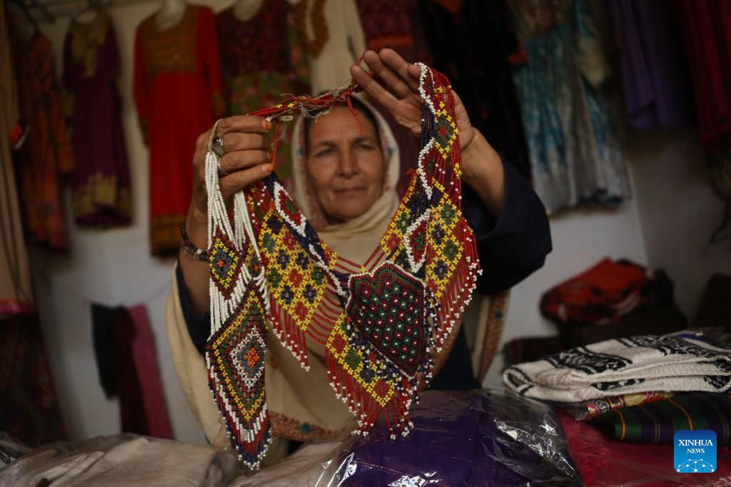 An Afghan woman shows handicrafts at a crafts market in Bamiyan city, central Afghanistan, March 19, 2022. (Photo by Saifurahman Safi/Xinhua)