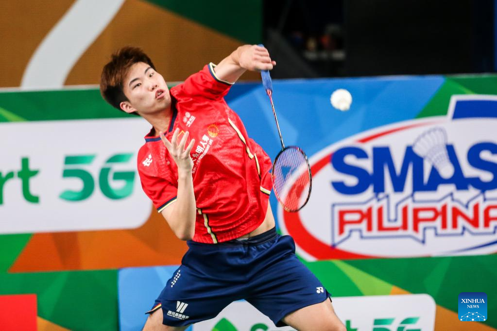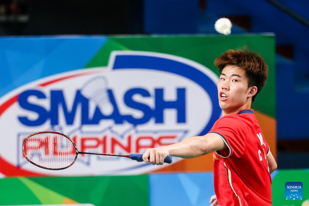 Weng Hongyang of China hits a return during the men's singles qualifying round match against Hussein Zayan Shaheed of Maldives at the Badminton Asia Championships 2022 in Manila, the Philippines on April 26, 2022. (Xinhua/Rouelle Umali)