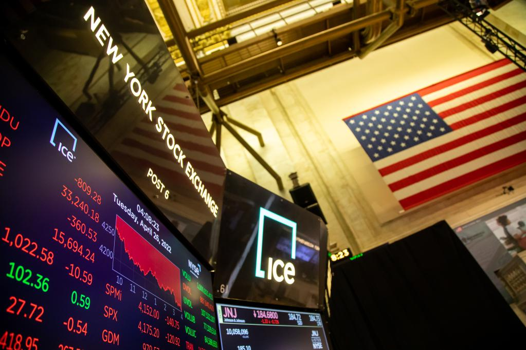 An electronic screen displays stock market information at the New York Stock Exchange (NYSE) in New York, the United States, April 26, 2022. U.S. stocks plunged on Tuesday with the tech-heavy Nasdaq closing down nearly 4 percent, as heavy selling intensified on Wall Street. The Dow Jones Industrial Average tumbled 809.28 points, or 2.38 percent, to 33,240.18. The S&P 500 fell 120.92 points, or 2.81 percent, to 4,175.20. The Nasdaq Composite Index shed 514.11 points, or 3.95 percent, to 12,490.74. (Photo by Michael Nagle/Xinhua)