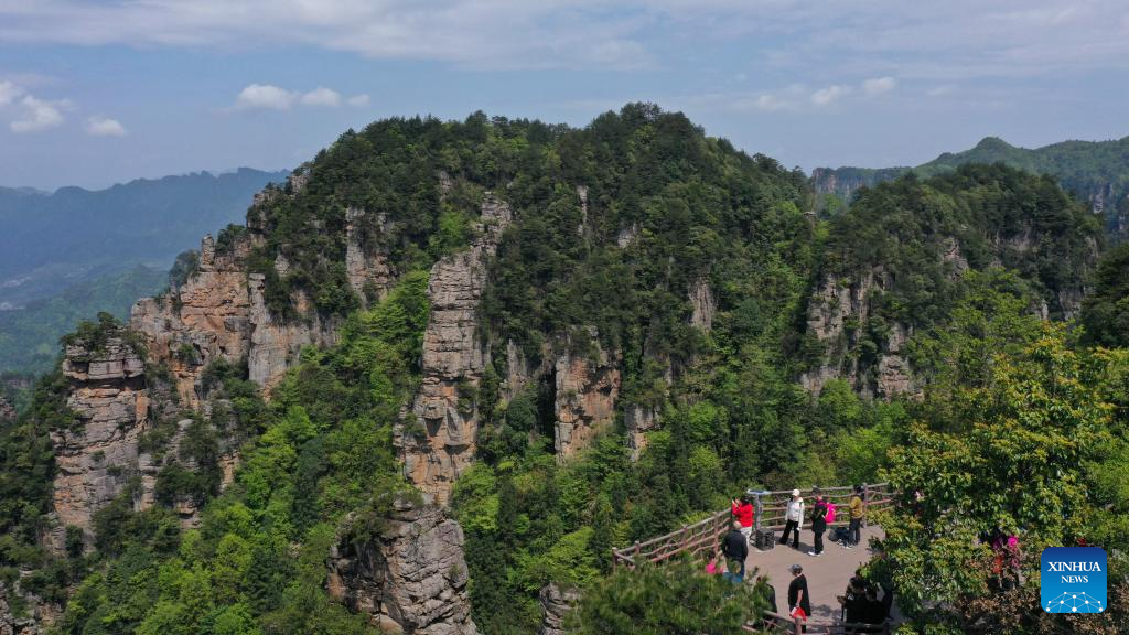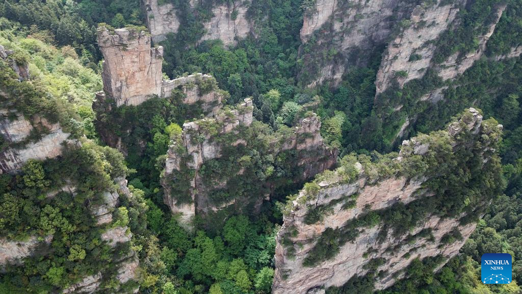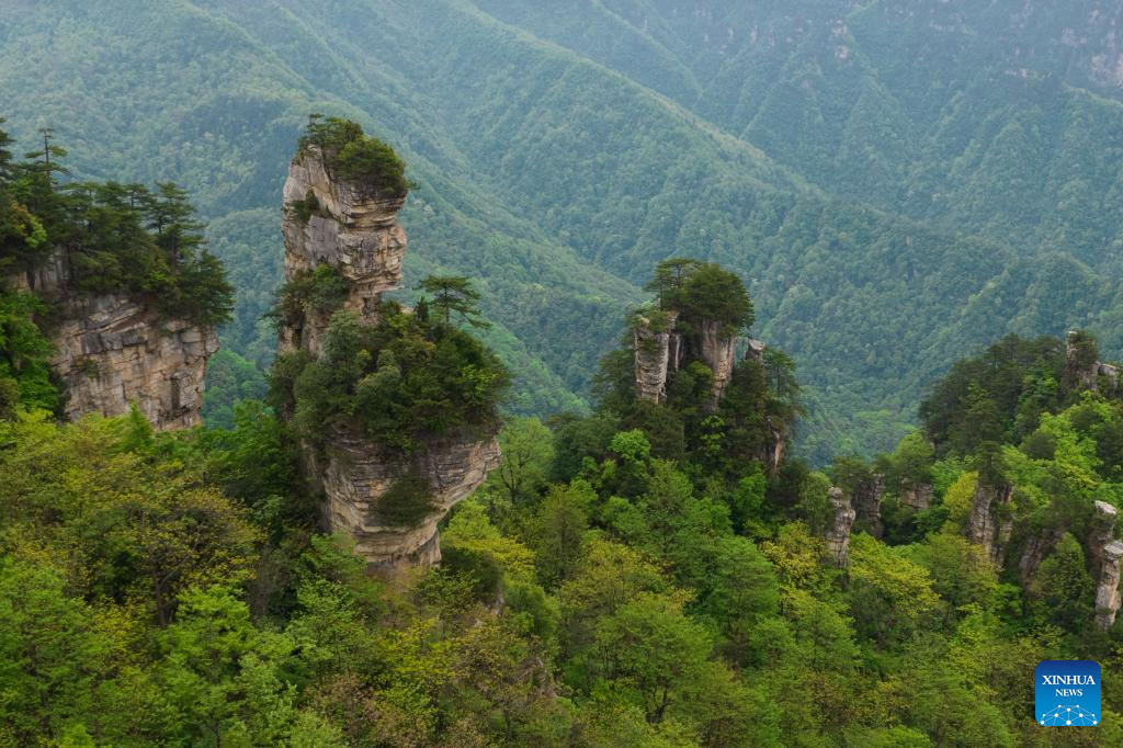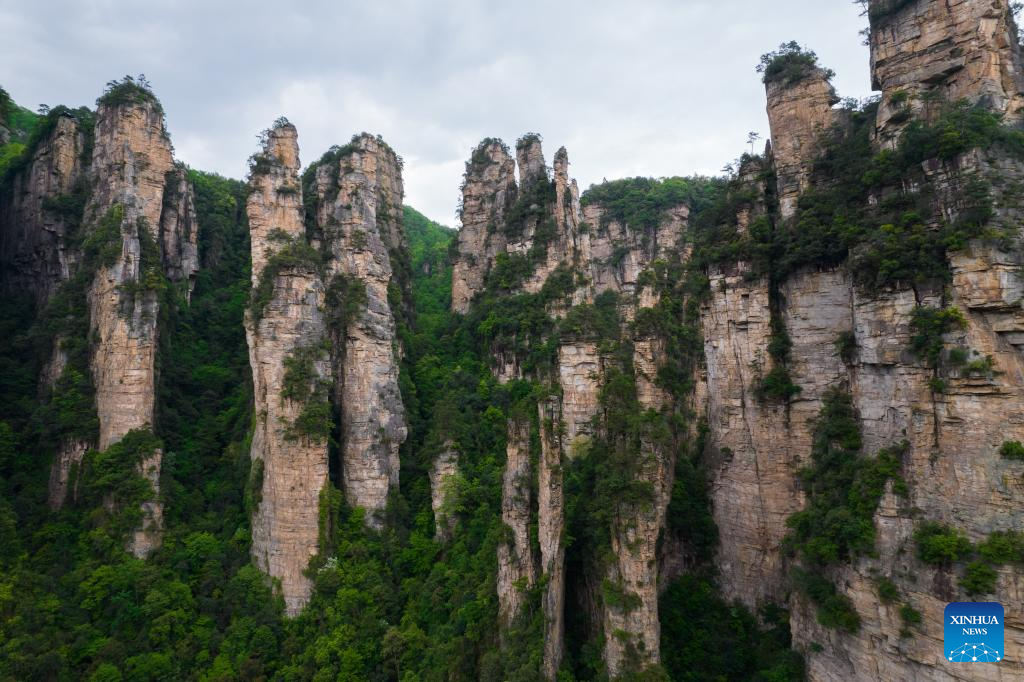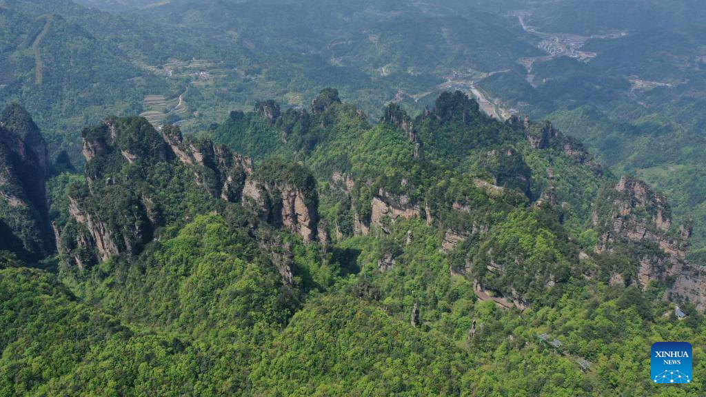 Aerial photo taken on April 20, 2022 shows a view of the Wulingyuan scenic area in Zhangjiajie, central China's Hunan Province. Wulingyuan, a UNESCO World Heritage Site, is noted for its unique quartzite sandstone pillars and peaks across most of the site. (Xinhua/Zhao Zhongzhi)