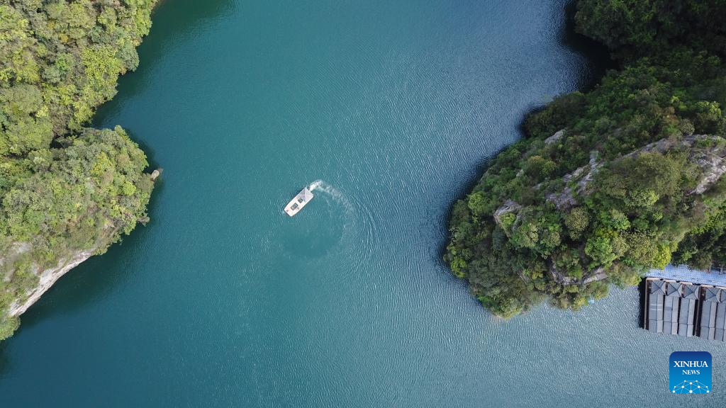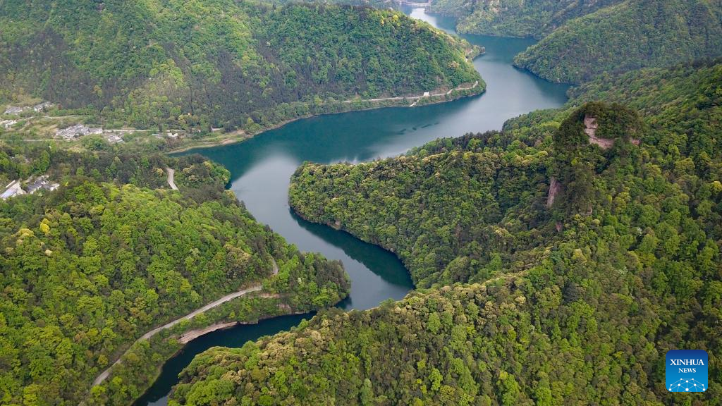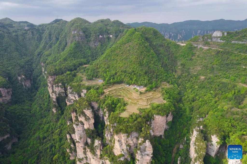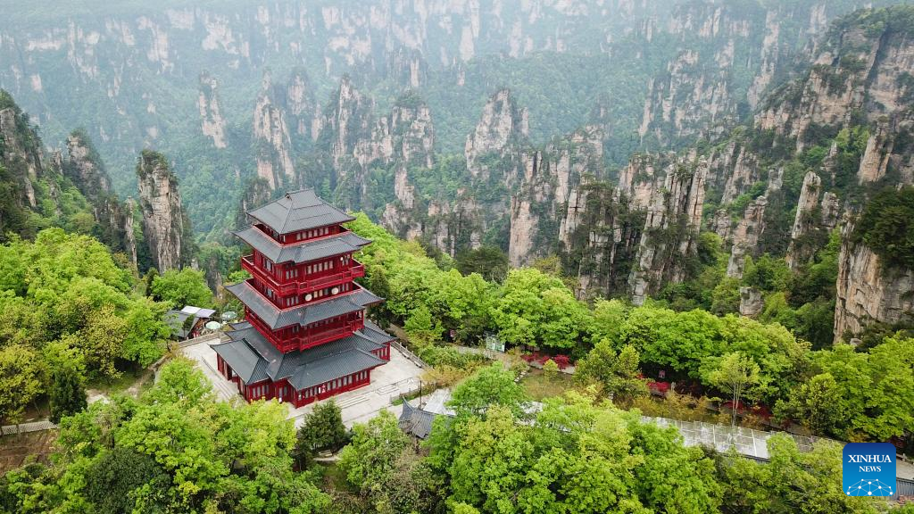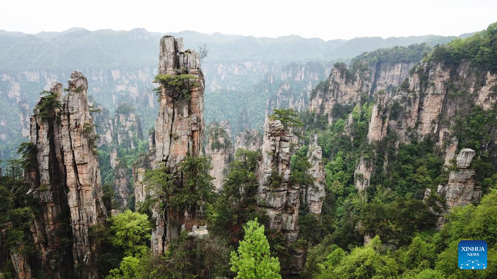 Aerial photo taken on April 20, 2022 shows a view of the Wulingyuan scenic area in Zhangjiajie, central China's Hunan Province. Wulingyuan, a UNESCO World Heritage Site, is noted for its unique quartzite sandstone pillars and peaks across most of the site. (Xinhua/Zhao Zhongzhi)