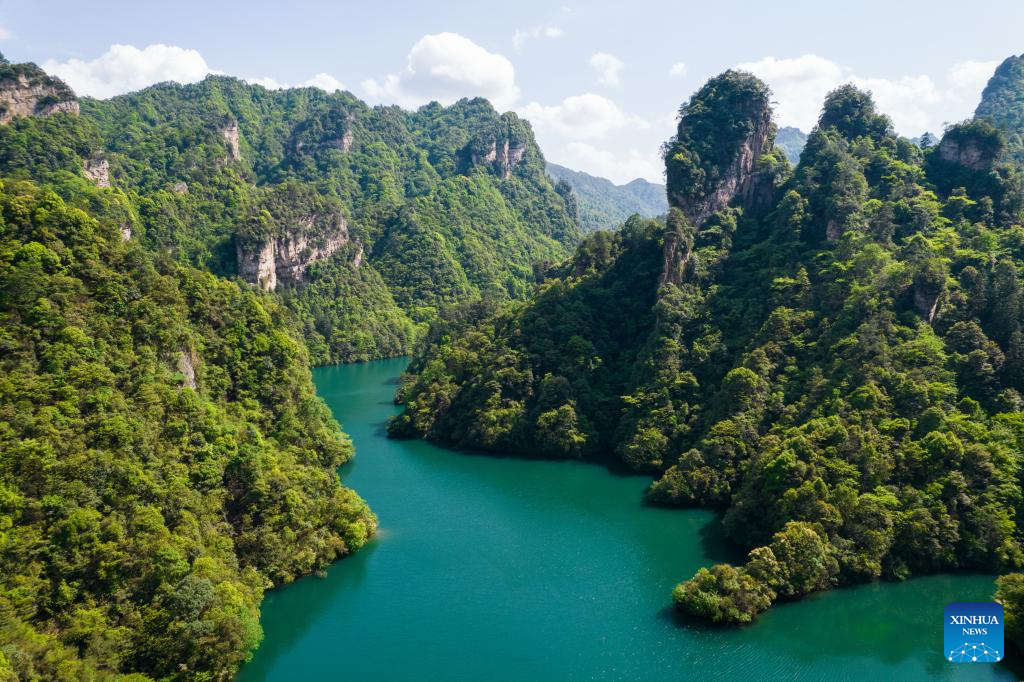 Aerial photo taken on April 20, 2022 shows a view of the Wulingyuan scenic area in Zhangjiajie, central China's Hunan Province. Wulingyuan, a UNESCO World Heritage Site, is noted for its unique quartzite sandstone pillars and peaks across most of the site. (Xinhua/Chen Zeguo)