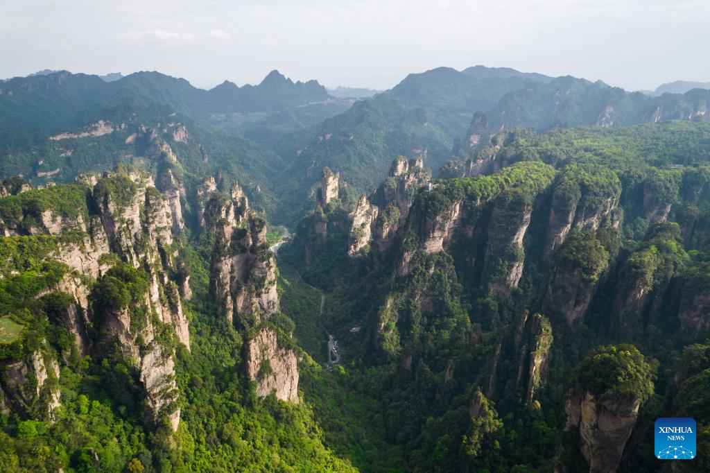 Aerial photo taken on April 19, 2022 shows a view of the Wulingyuan scenic area in Zhangjiajie, central China's Hunan Province. Wulingyuan, a UNESCO World Heritage Site, is noted for its unique quartzite sandstone pillars and peaks across most of the site. (Xinhua/Chen Sihan)