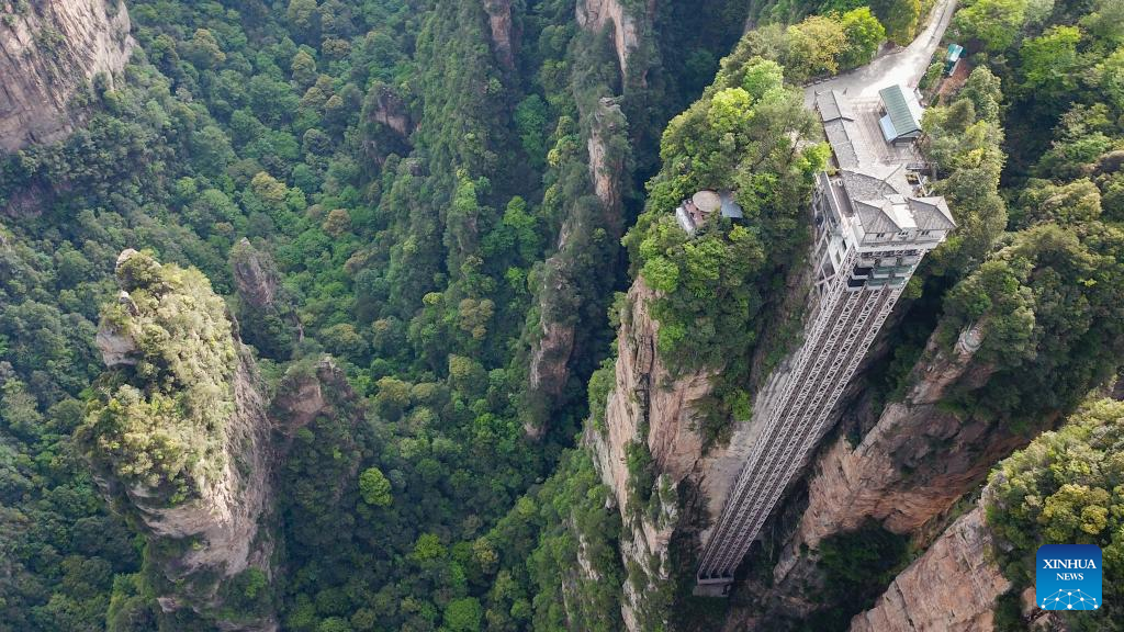 Aerial photo taken on April 19, 2022 shows the Bailong Elevator built onto the side of a huge cliff at the Wulingyuan scenic area in Zhangjiajie, central China's Hunan Province. Wulingyuan, a UNESCO World Heritage Site, is noted for its unique quartzite sandstone pillars and peaks across most of the site. (Xinhua/Chen Sihan)