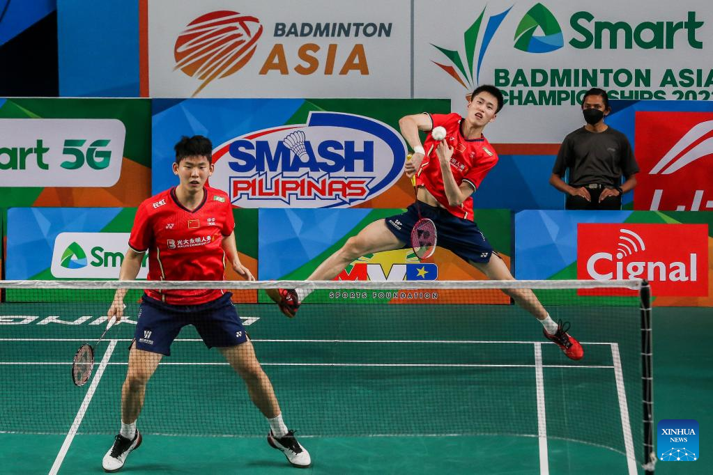 Liu Yuchen (L)/Ou Xuanyi of China compete during the men's doubles first round match against Law Cheuk Him/Lee Chun Hei Reginald of China's Hong Kong at the Badminton Asia Championships 2022 in Manila, the Philippines on April 26, 2022. (Xinhua/Rouelle Umali)