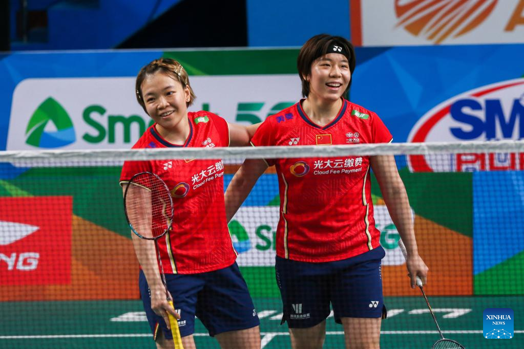 Chen Qingchen (L)/Jia Yifan of China react during their women's doubles first round match against Jeong Na Eun/Kim Hye Jeong of South Korea at the Badminton Asia Championships 2022 in Manila, the Philippines on April 27, 2022. (Xinhua/Rouelle Umali)