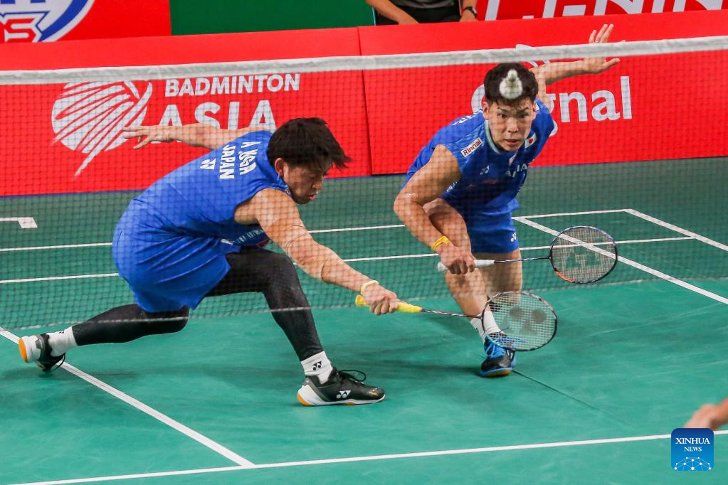 Taichi Saito (R)/Akira Koga of Japan compete during the men's doubles first round match against Muhammad Shohibul Fikri/Bagas Maulana of Indonesia at the Badminton Asia Championships 2022 in Manila, the Philippines on April 26, 2022. (Xinhua/Rouelle Umali)