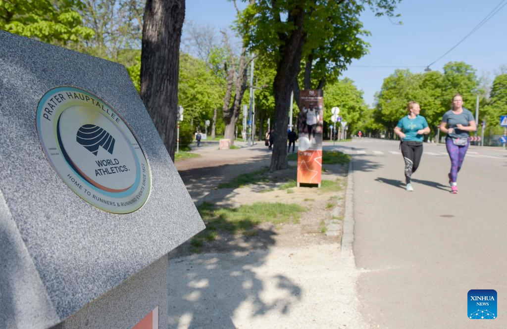 Photo taken on April 29, 2022 shows the sign of World Athletics Heritage Plaque of Prater Hauptallee in Vienna, Austria. The famous Prater Hauptallee was awarded the World Athletics Heritage Plaque in the category of "Landmark" earlier this April. (Xinhua/Guo Chen)