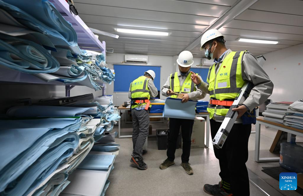 Liu Fei (1st R) works with technical management personnel at the second phase project of the national convention and exhibition center (Tianjin) in Tianjin, north China, April 27, 2022. Liu Fei, 38, the chief engineer of the national convention and exhibition center (Tianjin) project, has been working as a construction technician for 16 years. He is eager to perfect every detail in his work. The second phase project of the national convention and exhibition center (Tianjin) is expected to be put into use this year. (Xinhua/Sun Fanyue)