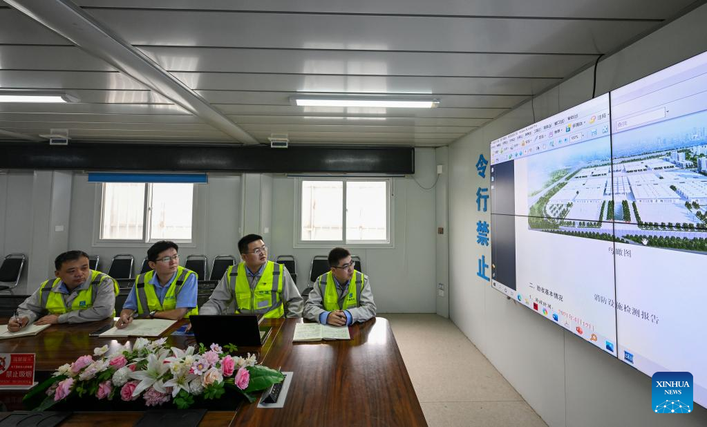 Liu Fei (2nd R) and technical management personnel attend a meeting at the second phase project of the national convention and exhibition center (Tianjin) in Tianjin, north China, April 27, 2022. Liu Fei, 38, the chief engineer of the national convention and exhibition center (Tianjin) project, has been working as a construction technician for 16 years. He is eager to perfect every detail in his work. The second phase project of the national convention and exhibition center (Tianjin) is expected to be put into use this year. (Xinhua/Sun Fanyue)
