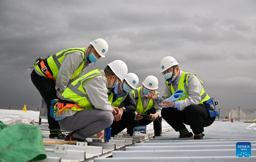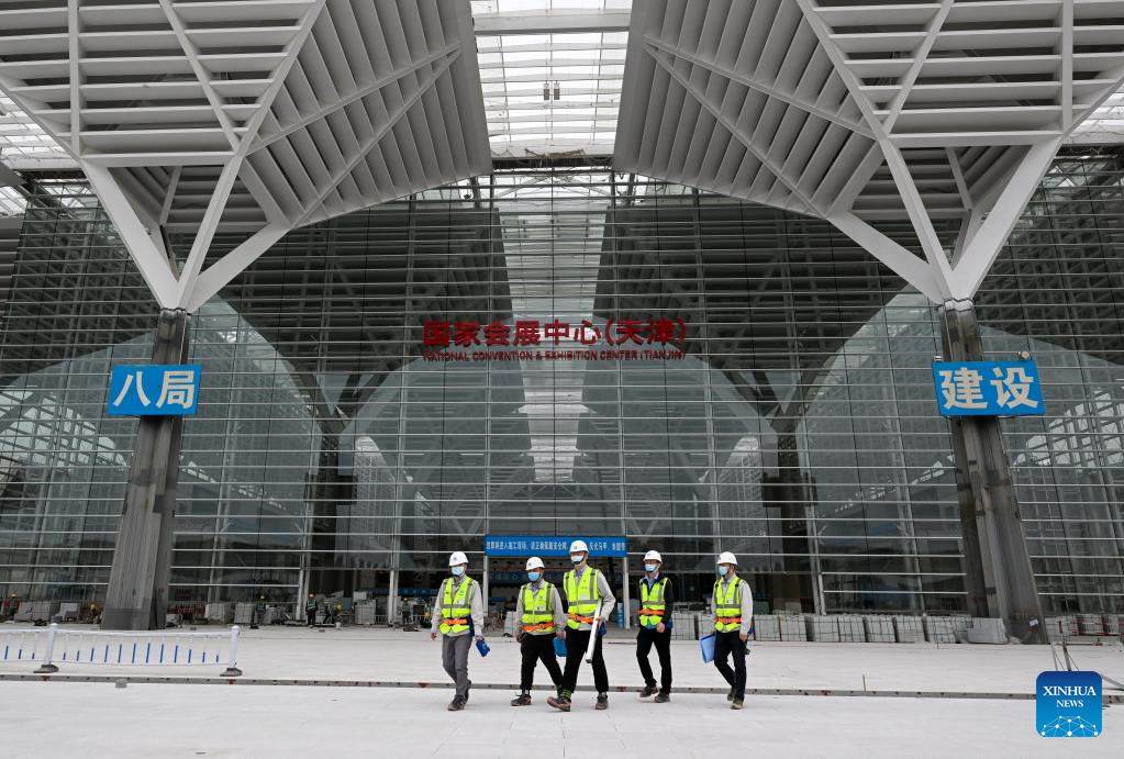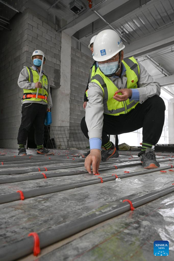 Liu Fei (front) works at the second phase project of the national convention and exhibition center (Tianjin) in Tianjin, north China, April 27, 2022. Liu Fei, 38, the chief engineer of the national convention and exhibition center (Tianjin) project, has been working as a construction technician for 16 years. He is eager to perfect every detail in his work. The second phase project of the national convention and exhibition center (Tianjin) is expected to be put into use this year. (Xinhua/Sun Fanyue)