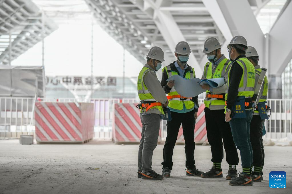 Liu Fei (R) talks with his colleagues at the second phase project of the national convention and exhibition center (Tianjin) in Tianjin, north China, April 27, 2022. Liu Fei, 38, the chief engineer of the national convention and exhibition center (Tianjin) project, has been working as a construction technician for 16 years. He is eager to perfect every detail in his work. The second phase project of the national convention and exhibition center (Tianjin) is expected to be put into use this year. (Xinhua/Sun Fanyue)
