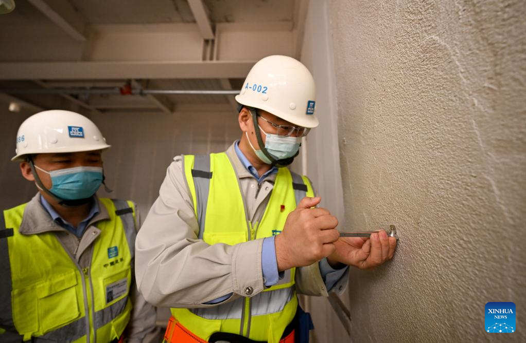 Liu Fei (R) measures the thickness of fireproof layer at the second phase project of the national convention and exhibition center (Tianjin) in Tianjin, north China, April 27, 2022. Liu Fei, 38, the chief engineer of the national convention and exhibition center (Tianjin) project, has been working as a construction technician for 16 years. He is eager to perfect every detail in his work. The second phase project of the national convention and exhibition center (Tianjin) is expected to be put into use this year. (Xinhua/Sun Fanyue)