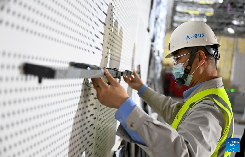 Liu Fei works at the second phase project of the national convention and exhibition center (Tianjin) in Tianjin, north China, April 27, 2022. Liu Fei, 38, the chief engineer of the national convention and exhibition center (Tianjin) project, has been working as a construction technician for 16 years. He is eager to perfect every detail in his work. The second phase project of the national convention and exhibition center (Tianjin) is expected to be put into use this year. (Xinhua/Sun Fanyue)