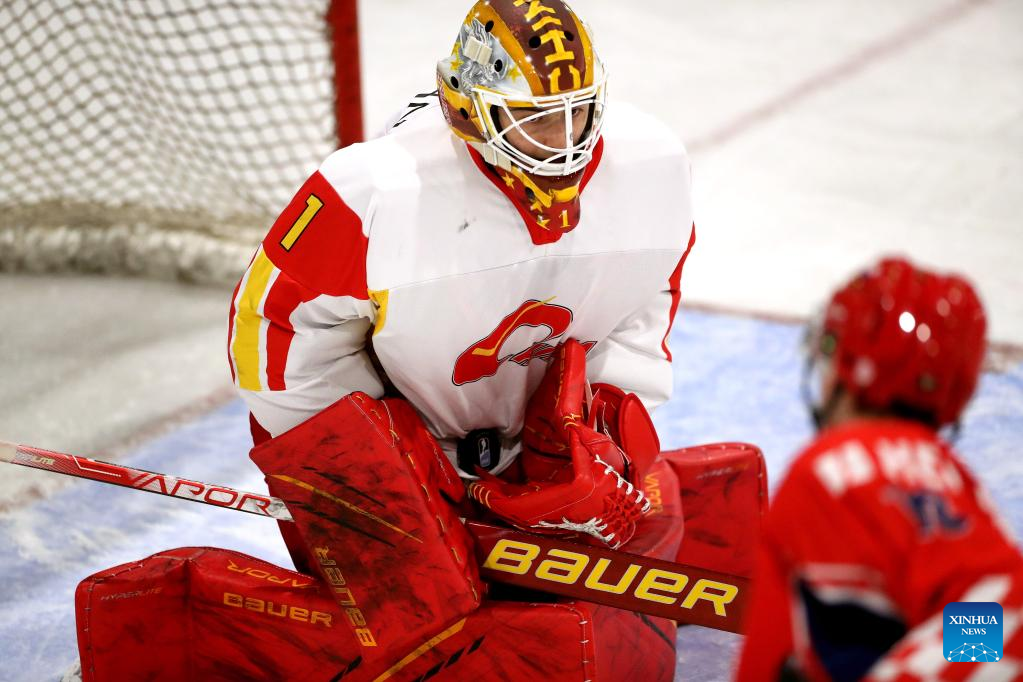 Goalkeepr Ouban Yongli of China reacts during the Ice Hockey World Championship Division II Group A match between China and Croatia at Velesajam Ice Rink in Zagreb, Croatia, on April 29, 2022. (Luka Stanzl/PIXSELL via Xinhua)
