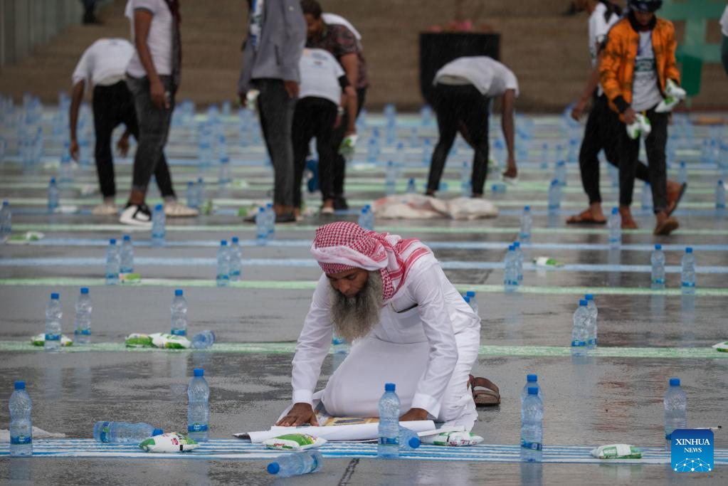 A devotee prays under the rain as he attends a street Iftar to break fast of the holy Islamic month of Ramadan in Addis Ababa, Ethiopia, April 29, 2022. (Xinhua/Michael Tewelde)