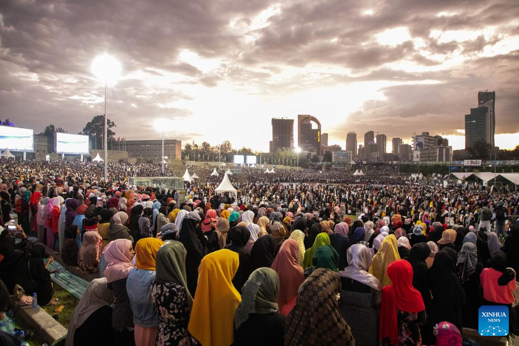 Ddevotees attend a street Iftar to break fast of the Islamic holy month of Ramadan at Meskel Square in Addis Ababa, Ethiopia, on April 29, 2022. (Xinhua/Michael Tewelde)