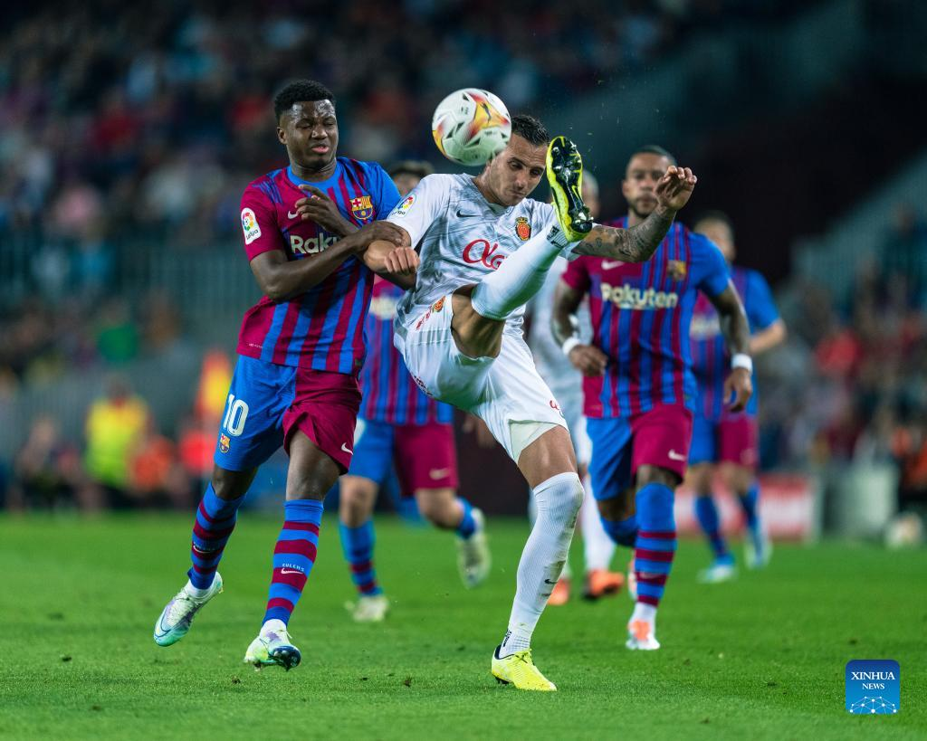 Barcelona's Ansu Fati (L) vies with Mallorca's Franco Russo during a La Liga Santander match between FC Barcelona and RCD Mallorca in Camp Nou, Barcelona, Spain, on May 1, 2022. (Photo by Joan Gosa/Xinhua)