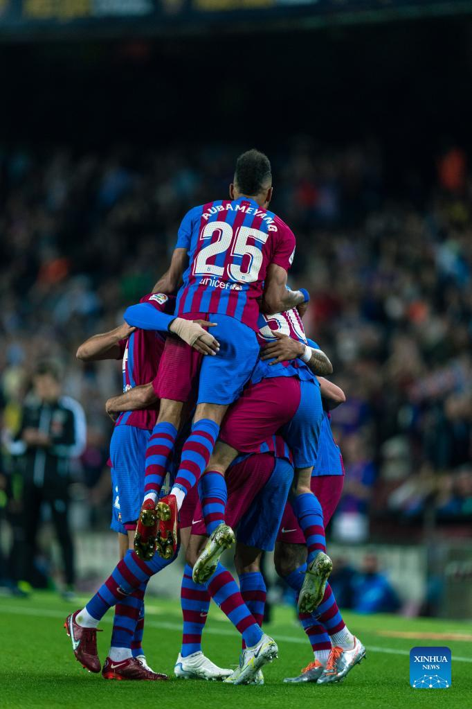 Barcelona's players celebrate a goal during a La Liga Santander match between FC Barcelona and RCD Mallorca in Camp Nou, Barcelona, Spain, on May 1, 2022. (Photo by Joan Gosa/Xinhua)