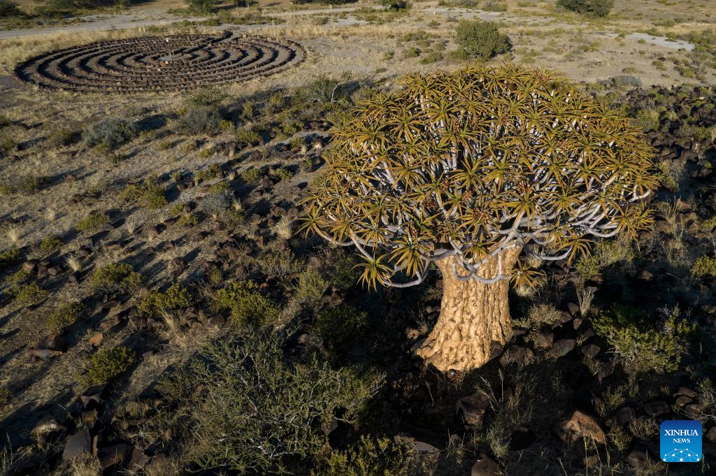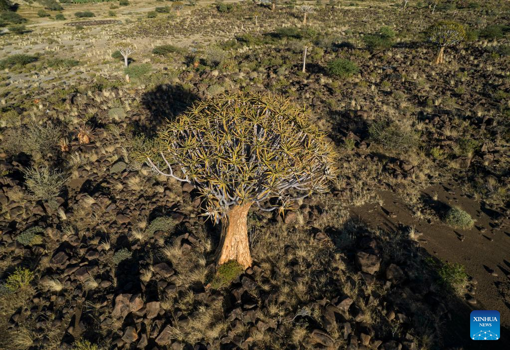 Aerial photo taken on April 30, 2022 shows a quiver tree in Keetmanshoop, southern Namibia. The quiver tree is an aloe vera plant that can adapt to the dry and hot climate of Namibia. The average height of an adult quiver tree is about 5 meters. It is said that in the past, local tribes used the branches of the quiver tree to make bags for holding arrows, hence the name of the quiver tree. (Xinhua/Chen Cheng)