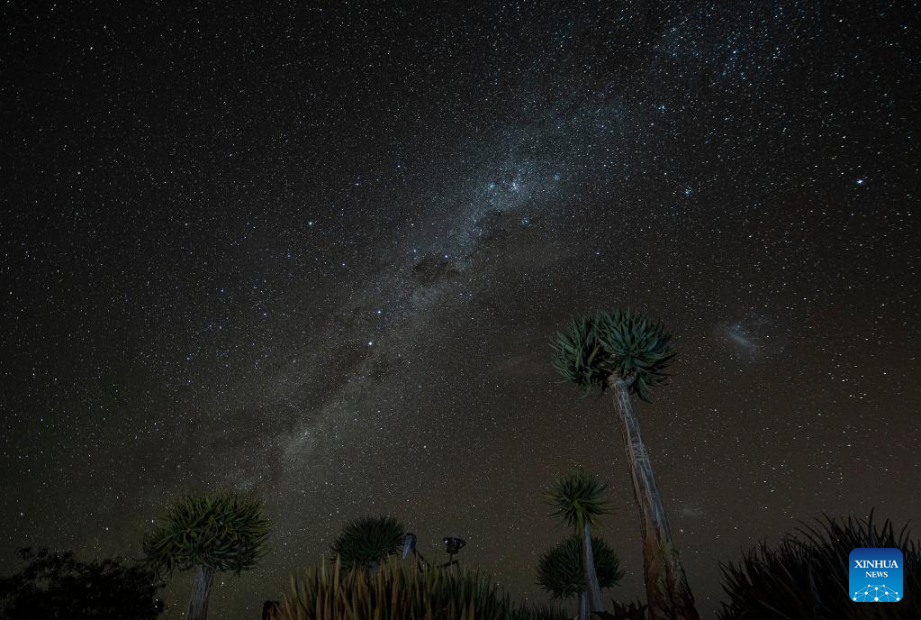 Photo taken on April 29, 2022 shows quiver trees under the stars in Keetmanshoop, southern Namibia. The quiver tree is an aloe vera plant that can adapt to the dry and hot climate of Namibia. The average height of an adult quiver tree is about 5 meters. It is said that in the past, local tribes used the branches of the quiver tree to make bags for holding arrows, hence the name of the quiver tree. (Xinhua/Chen Cheng)