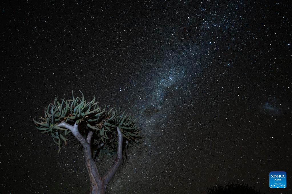 Photo taken on April 29, 2022 shows a quiver tree under the stars in Keetmanshoop, southern Namibia. The quiver tree is an aloe vera plant that can adapt to the dry and hot climate of Namibia. The average height of an adult quiver tree is about 5 meters. It is said that in the past, local tribes used the branches of the quiver tree to make bags for holding arrows, hence the name of the quiver tree. (Xinhua/Chen Cheng)