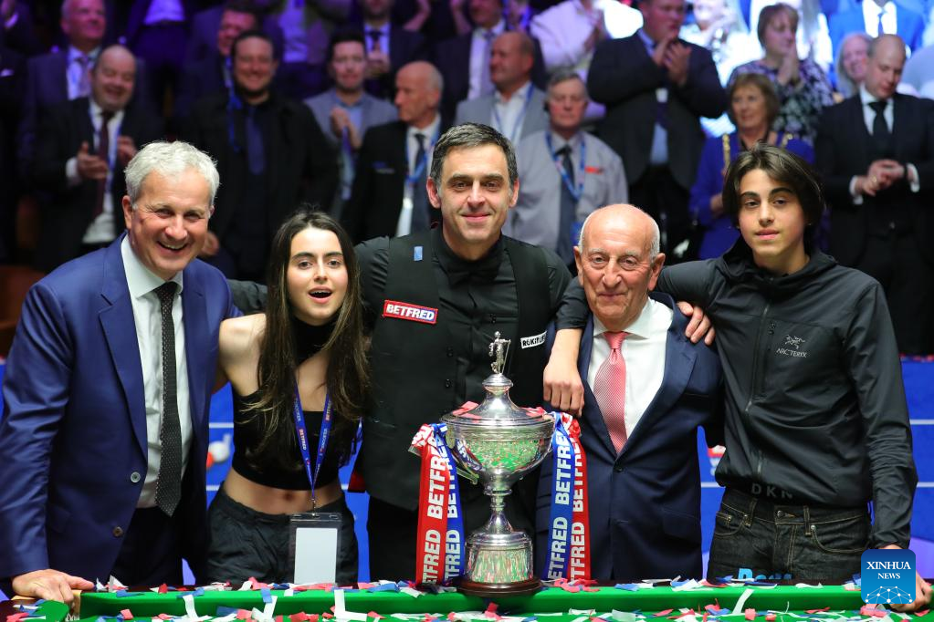 England's Ronnie O'Sullivan (C) celebrates with the trophy during the awarding ceremony after the final over England's Judd Trump at the Betfred World Snooker Championship in Sheffield, England, May 2, 2022. (Photo by Zhai Zheng/Xinhua)