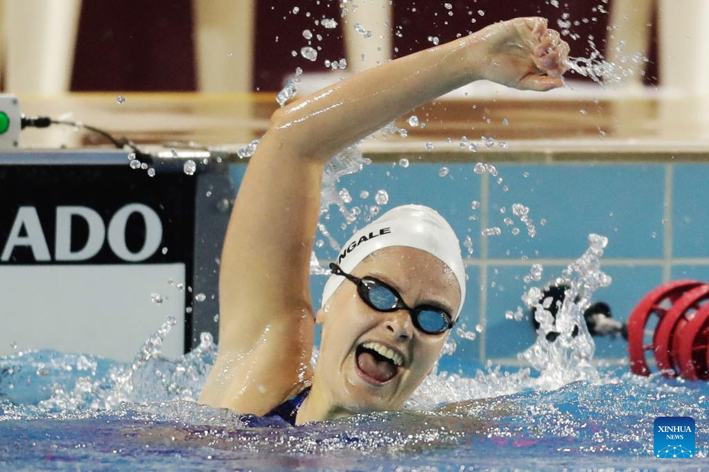 Emily Rene Massengale of the United States reacts after the women's 100-meter backstroke final at the 24th Deaflympics in Caxias do Sul, Brazil's state of Rio Grande do Sul, on May 2, 2022. (Photo by Lucio Tavora/Xinhua)