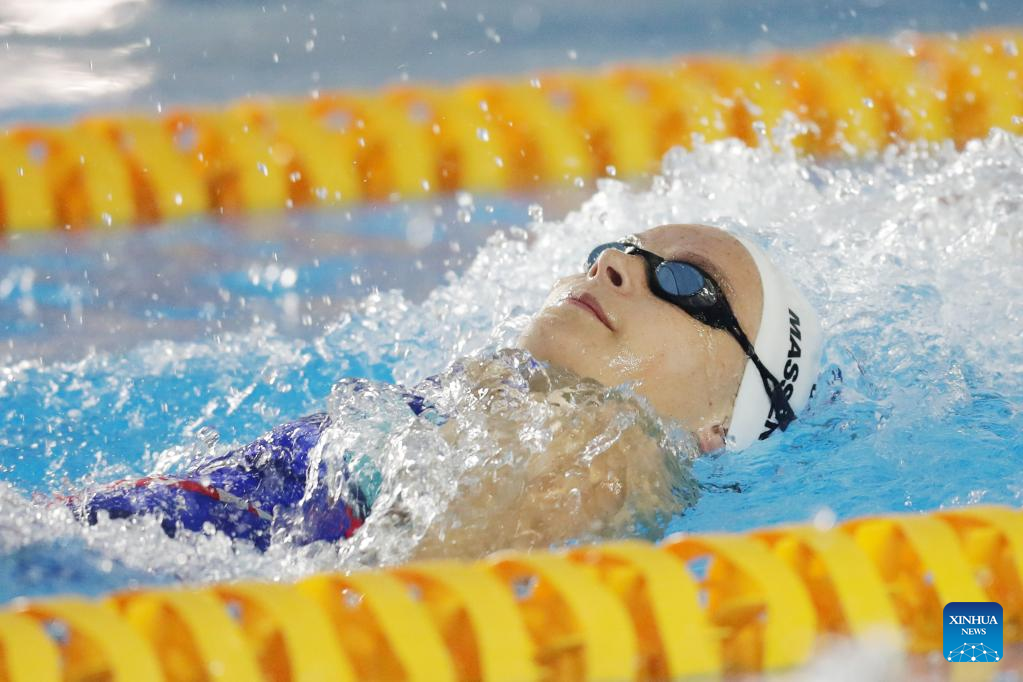Emily Rene Massengale of the United States competes during the women's 100-meter backstroke final at the 24th Deaflympics in Caxias do Sul, Brazil's state of Rio Grande do Sul, on May 2, 2022. (Photo by Lucio Tavora/Xinhua)