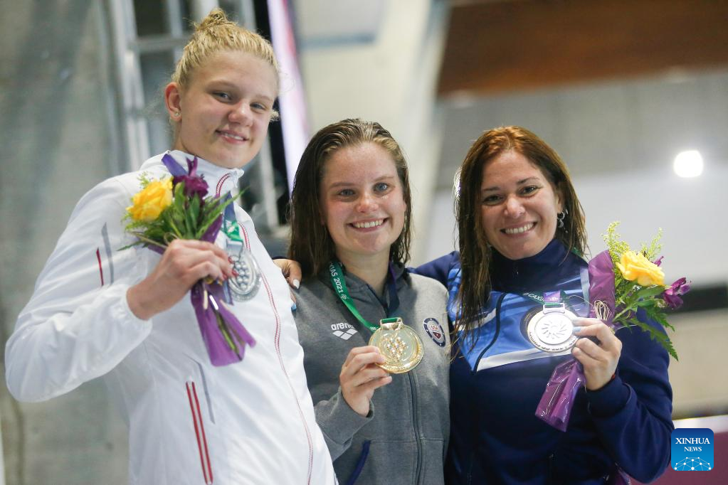 Gold medalist Emily Rene Massengale (C) of the United States takes picture during the awarding ceremony of the women's 100-meter backstroke final at the 24th Deaflympics in Caxias do Sul, Brazil's state of Rio Grande do Sul, on May 2, 2022. (Photo by Lucio Tavora/Xinhua)