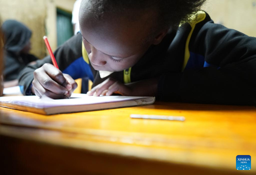 A child studies at a school in Mathare slum area, Nairobi, Kenya, April 28, 2022.(Xinhua/Dong Jianghui)