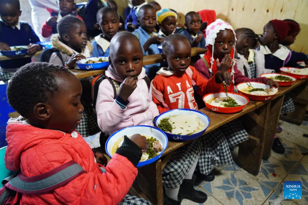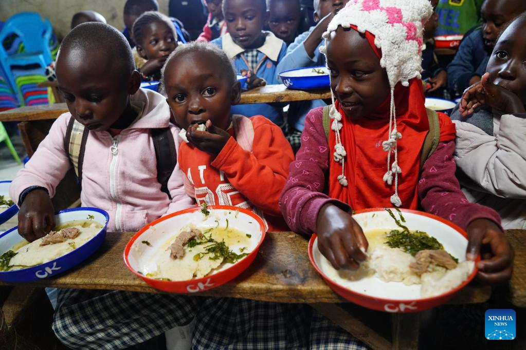 Children have free school lunch in Mathare slum area, Nairobi, Kenya, April 28, 2022.(Xinhua/Dong Jianghui)
