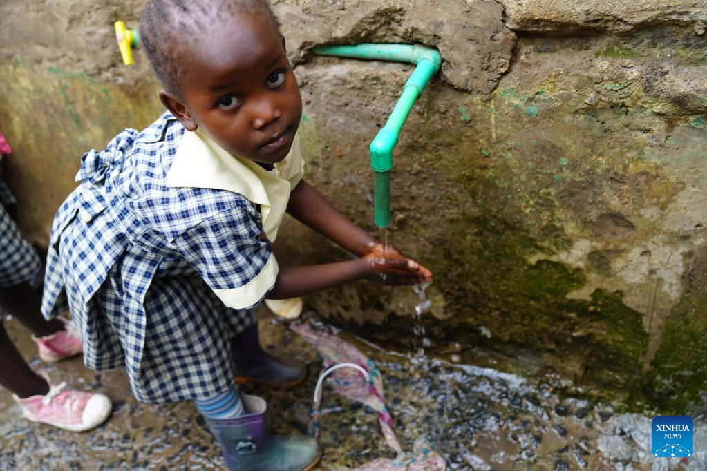 A child washes her hands before meal at a school in Mathare slum area, Nairobi, Kenya, April 28, 2022.(Xinhua/Dong Jianghui)