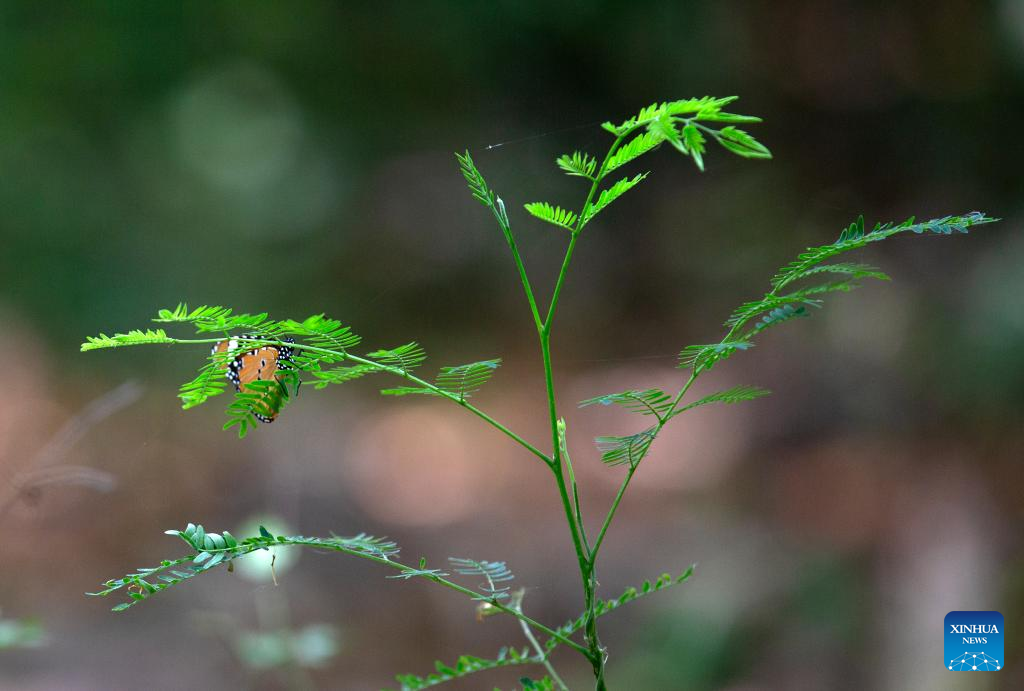 A butterfly rests on a twig of grass in Sunder Nursery, a heritage park, in New Delhi, India, May 6, 2022. (Xinhua/Javed Dar)