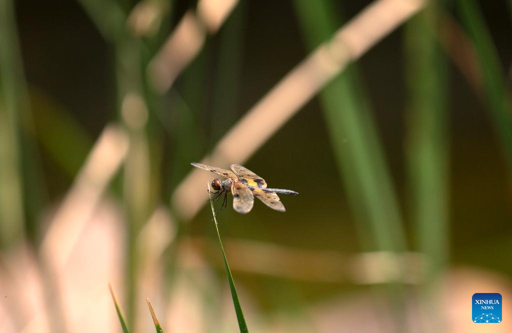 A dragonfly rests on a twig of grass in Sunder Nursery, a heritage park, in New Delhi, India, May 6, 2022. (Xinhua/Javed Dar)