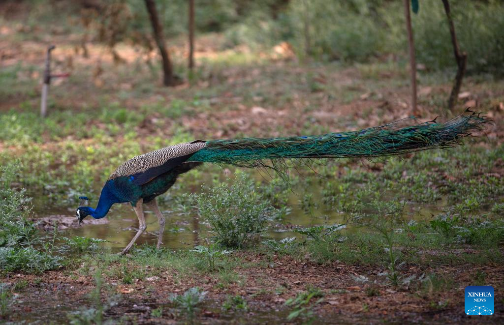 A peacock drinks at a wet patch in Sunder Nursery, a heritage park, in New Delhi, India, May 6, 2022. (Xinhua/Javed Dar)