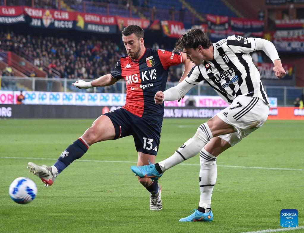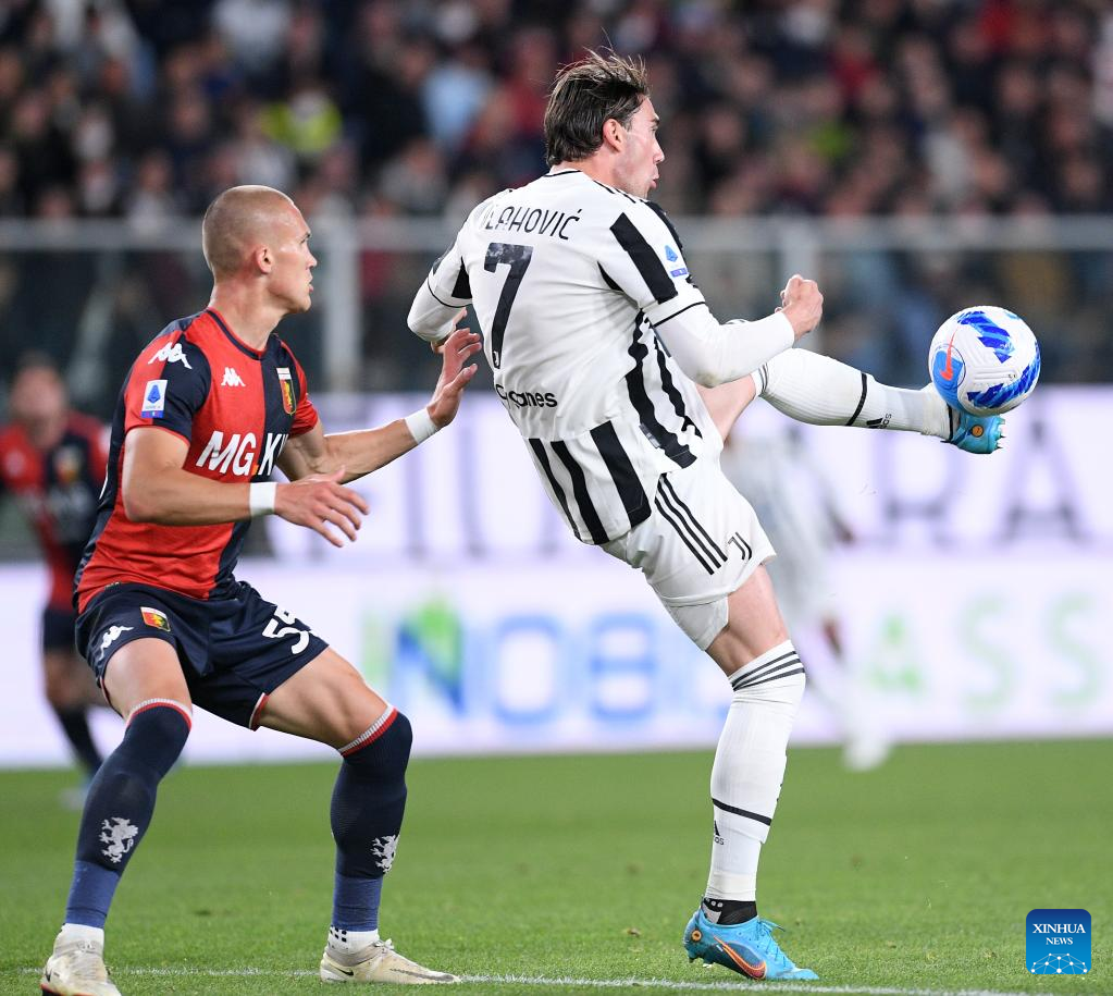 FC Juventus' Dusan Vlahovic (R) vies with Genoa's Leo Ostigard during a Serie A football match between Genoa and FC Juventus in Genova, Italy, on May 6, 2022. (Str/Xinhua)