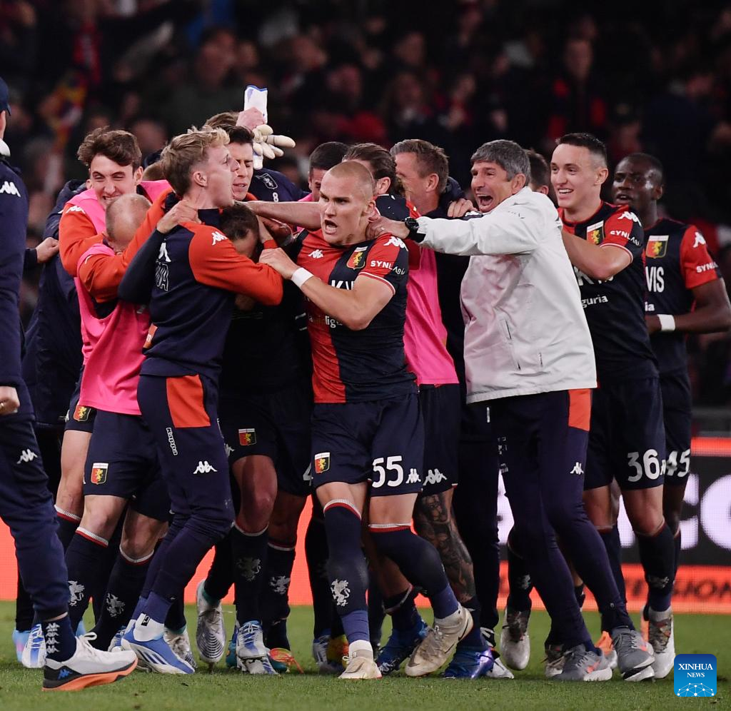 Genoa's players celebrate after a Serie A football match between Genoa and FC Juventus in Genova, Italy, on May 6, 2022. (Str/Xinhua)