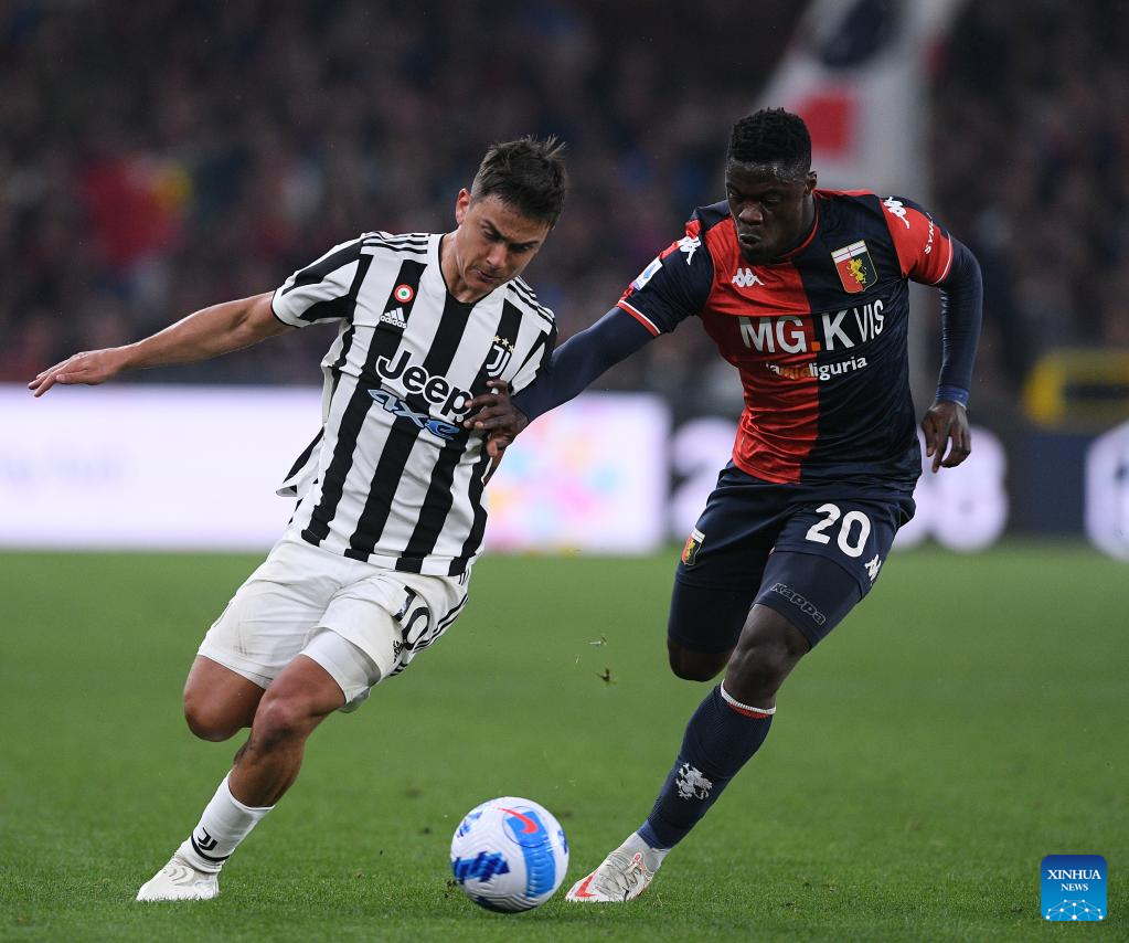 FC Juventus' Paulo Dybala (L) vies with Genoa's Caleb Ekuban during a Serie A football match between Genoa and FC Juventus in Genova, Italy, on May 6, 2022. (Str/Xinhua)