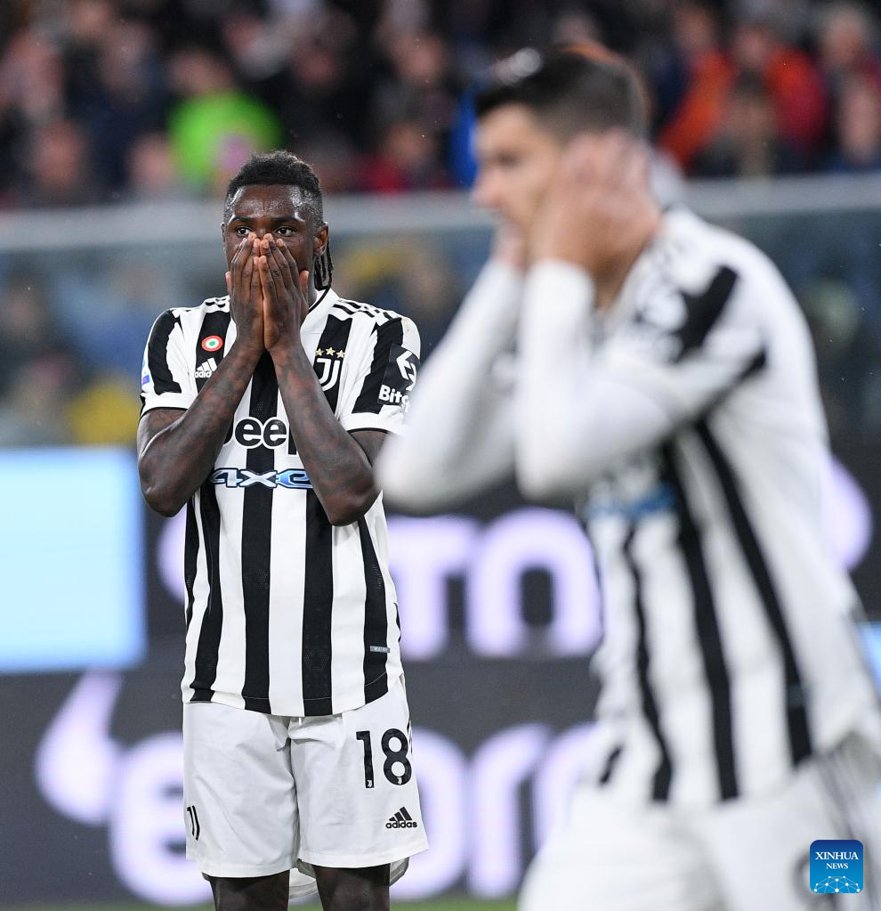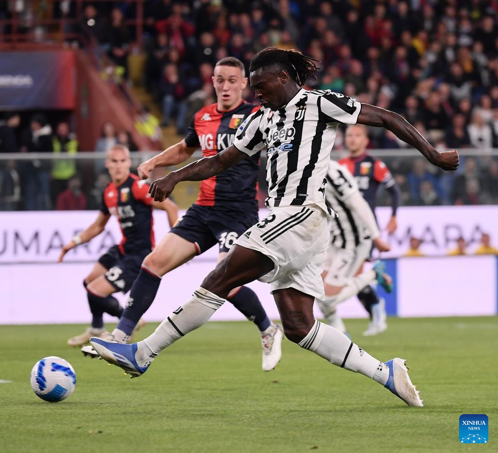 FC Juventus' Moise Kean (L) reacts during a Serie A football match between Genoa and FC Juventus in Genova, Italy, on May 6, 2022. (Str/Xinhua)